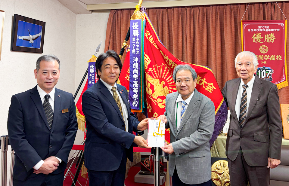 琉球銀行(頭取 島袋 健)役職員一同は、第98回選抜高等学校野球大会への出場が決定した沖縄尚学高等学校を訪問し、寄付金を贈呈いたしました。常務執行役員の平岡より「昨年の旋風を再び巻き起こしていただき、夏春連覇を期待しています。」と選手を激励し、末吉校長に目録を贈呈いたしました。