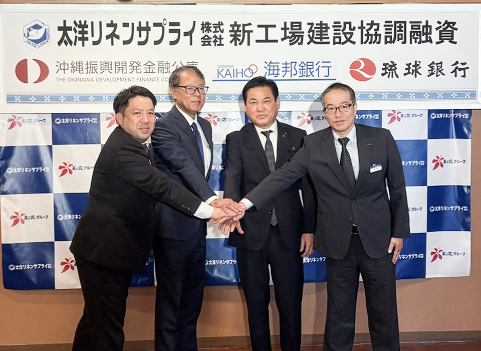 琉球銀行(頭取 島袋 健)は、太洋リネンサプライ株式会社(代表取締役 親盛 一功)に対し、沖縄振興開発金融公庫および沖縄海邦銀行との協調融資を通じて、太洋リネンサプライ株式会社が取り組む新工場の建設を支援したことをお知らせいたします。