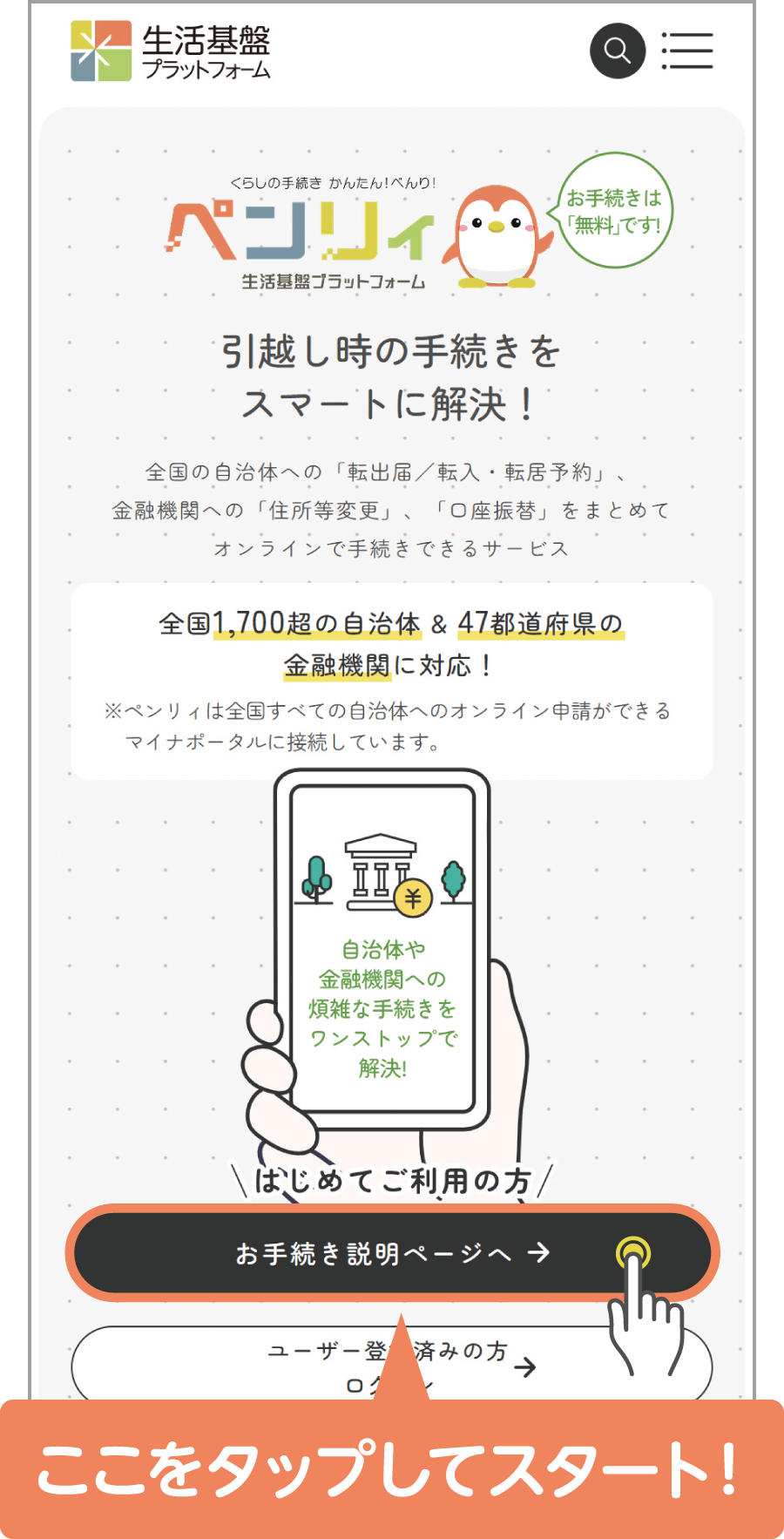 ペンリィなら操作もカンタン!「新規ユーザー登録」を済ませたら、自治体や金融機関のページで手続きを選ぶだけ。すぐに使えてとっても便利です!