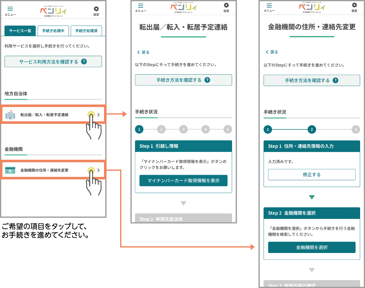 スマートフォンとマイナンバーカードを活用して、全国の自治体への「転出届/転入・転居予約」、金融機関やインフラ企業への「住所等変更」「口座振替」手続きを、窓口に行く手間なくオンラインで完結いただけます。
